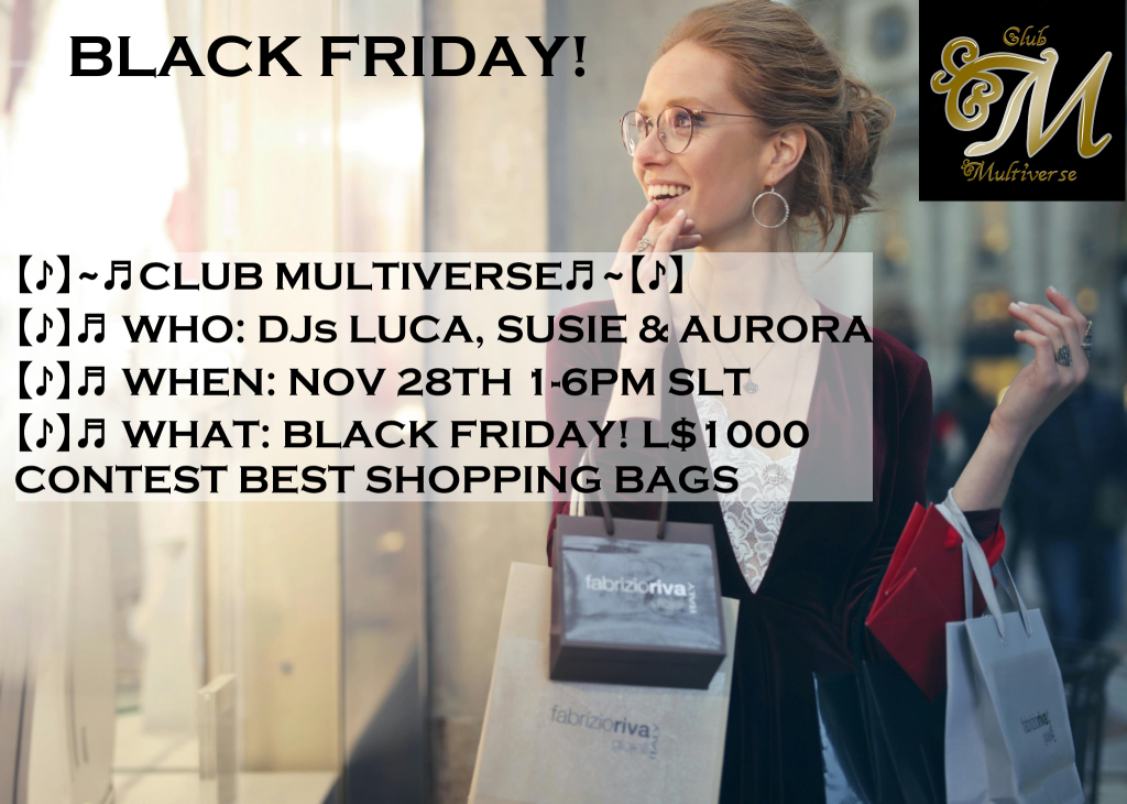 Uncategorized NOV 28TH – BLACK FRIDAY CONTEST AuroraJade October 18, 2025 【♪】~♬CLUB MULTIVERSE♬~【♪】【♪】♬ WHO: DJs LUCA, SUSIE & AURORA【♪】♬ WHEN: NOV 28TH 1-6PM【♪】♬ WHAT: BLACK FRIDAY! L$1000 CONTEST BEST SHOPPING BAG【♪】♬ WHERE: http://maps.secondlife.com/secondlife/Upper%20Fenland/145/22/2005 Continue Reading Previous: NOV 21ST – FALL NIGHTS CONTESTNext: DEC 5TH – UGLY SWEATER CONTEST