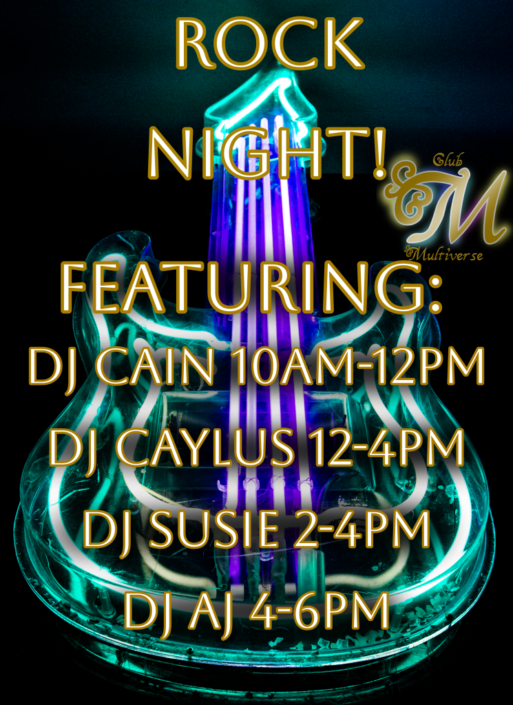 Upcoming Events THURSDAY – Rock Night! MandaPanda February 2, 2026 【♪】~♬CLUB MULTIVERSE♬~【♪】 【♪】♬ WHO: DJs CAIN, CAYLUS, SUSIE & AJ 【♪】♬ WHEN: 10AM-6PM 【♪】♬ WHAT: ROCK NIGHT 【♪】♬ WHERE: http://maps.secondlife.com/secondlife/Crystal%20Water/117/71/22 【♪】♬LISTEN ANYWHERE! http://radio.clubmultiversesl.com:7796 Continue Reading Previous: WEDNESDAY – Various Night!Next: FRIDAY – Top 40 Night!